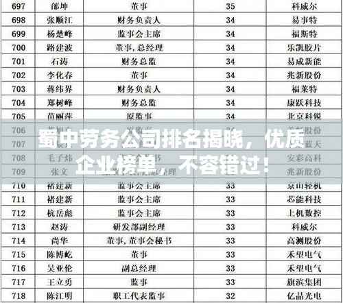 随着经济的发展和社会的进步,劳务公司在各行各业中发挥着越来越重要的作用,蜀中地区作为中国经济的重要组成部分,其劳务公司的发展尤为引人注目,本文将为您介绍蜀中地区的劳务公司排名,以便您更好地了解这一领域的发展状况。