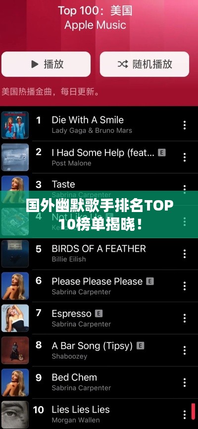 音乐无国界,幽默更是全人类共通的语言,在国外的音乐舞台上,那些既拥有卓越音乐才华又具备幽默天赋的歌手,总是能赢得众多粉丝的喜爱,以下是国外幽默歌手排名前十名,他们不仅在音乐上取得了卓越成就,更以独特的幽默风格让人们笑声不断。