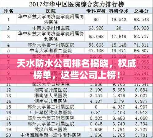 随着城市化建设的不断推进,防水工程在建筑领域的重要性日益凸显,作为专业的防水服务提供商,天水地区的防水公司在保障城市建设的质量和居民生活安全方面发挥着重要作用,本文将探讨天水防水公司的排名,以供参考。