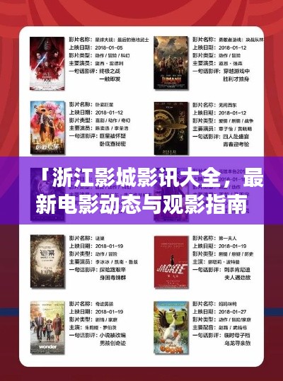 通过百度搜索“浙江影城影讯”,观众可以轻松获取最新的电影动态、影讯查询、观影指南、在线订票与选座等信息,浙江影城作为优质的电影院线品牌,为广大影迷提供了良好的观影体验,希望本文能为您的观影之旅提供帮助,让您轻松享受到电影带来的快乐。