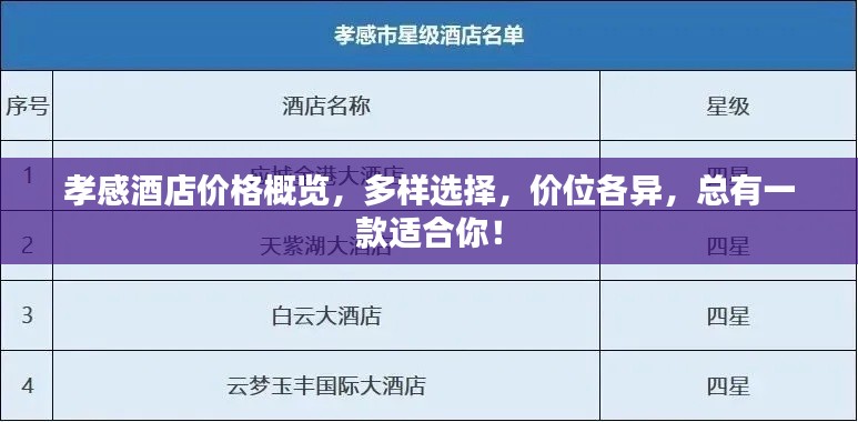 孝感市作为湖北省的一个重要城市,以其丰富的历史文化和繁荣的旅游业著称,随着旅游业的不断发展,孝感酒店的数量和种类也在不断增加,满足了不同消费者的需求,本文将为您概述孝感酒店的价格及其相关特点。