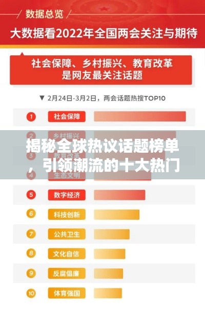 世界顶级话题排名涵盖了多个领域,包括环境、经济、科技、政治安全等各个方面,这些话题不仅关乎全球发展,也影响每个人的生活,关注这些话题,了解全球动态,有助于我们更好地融入世界大家庭。